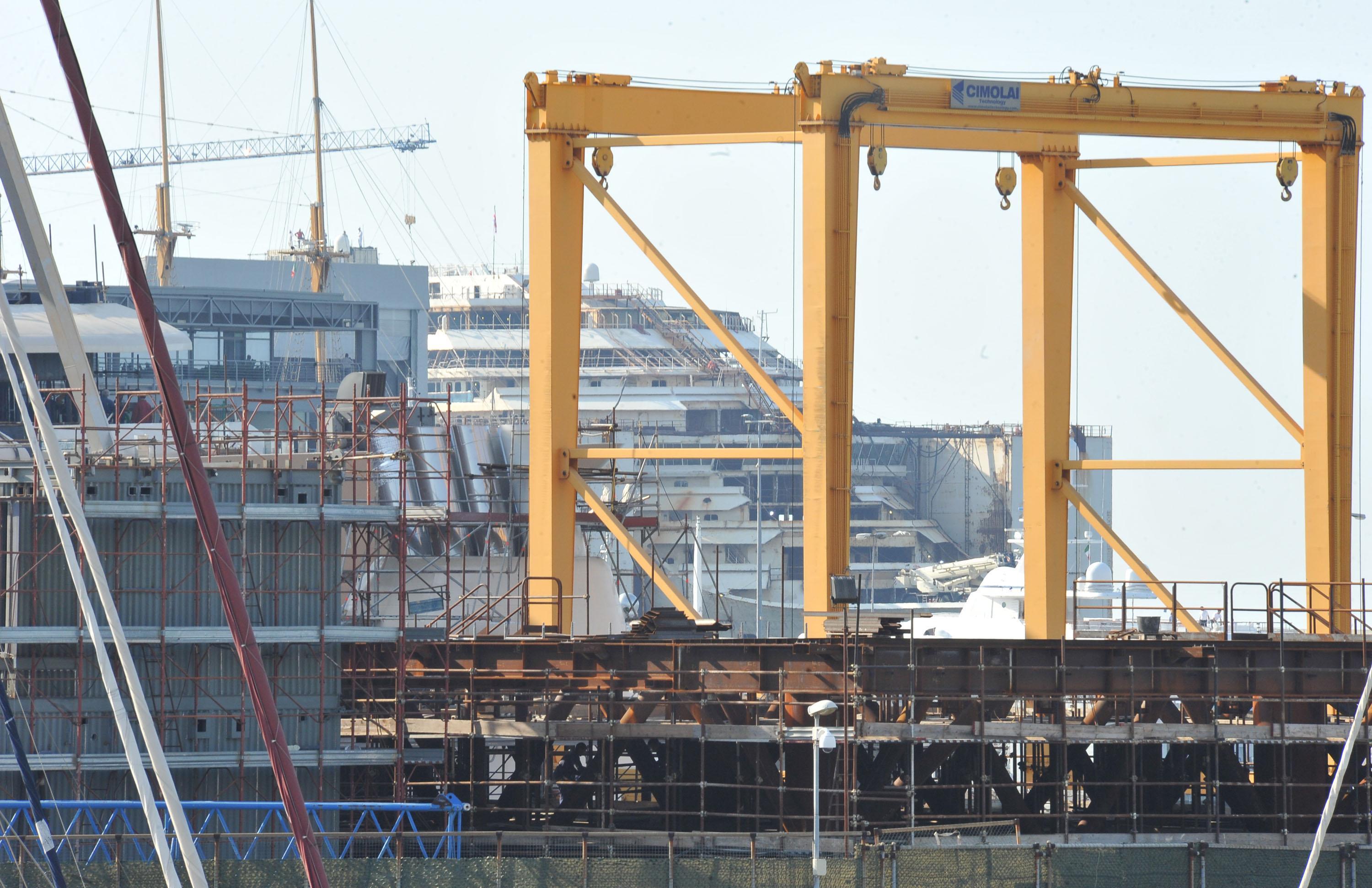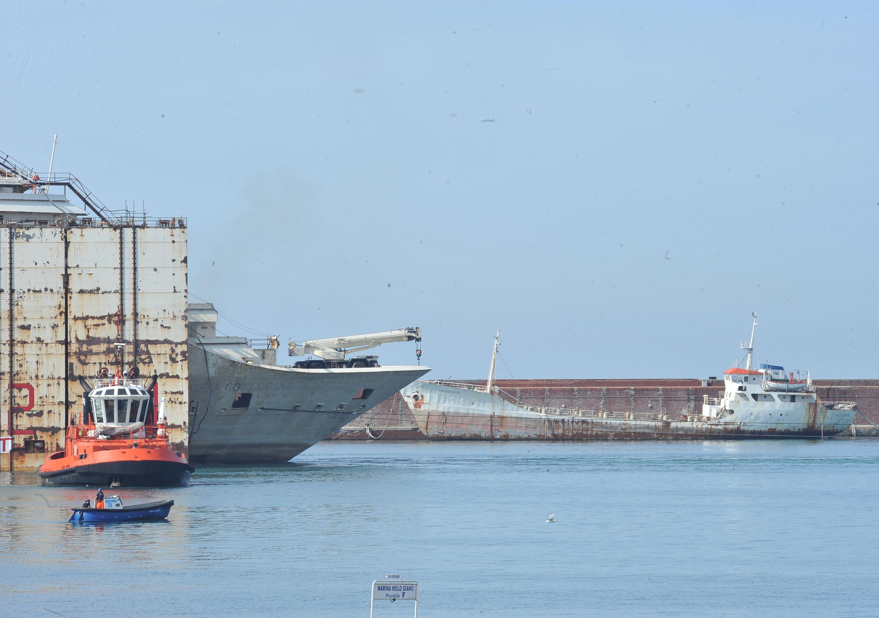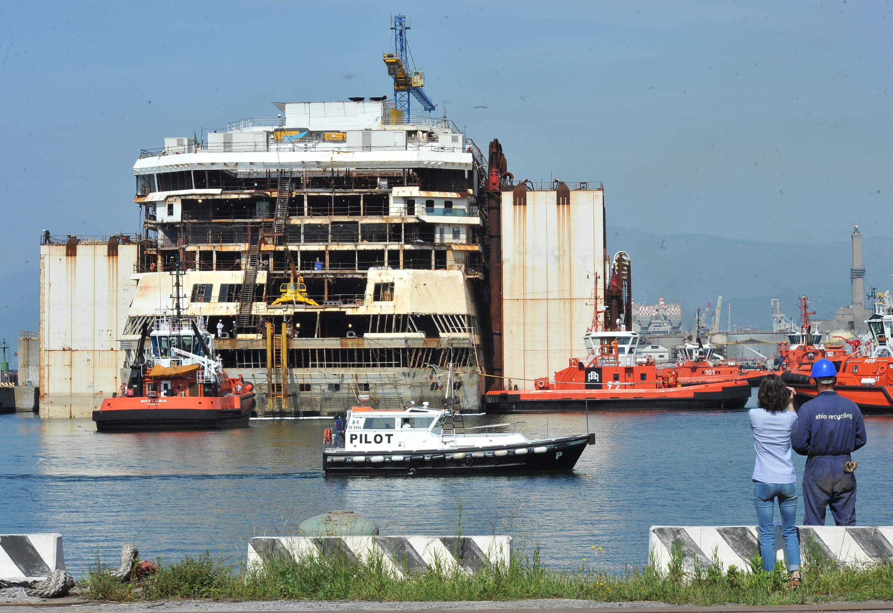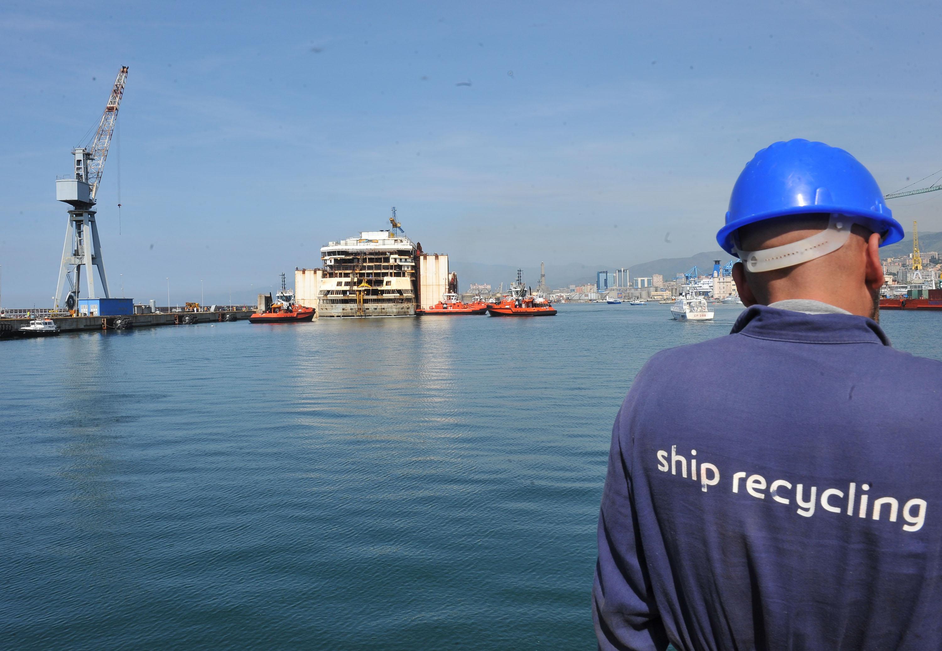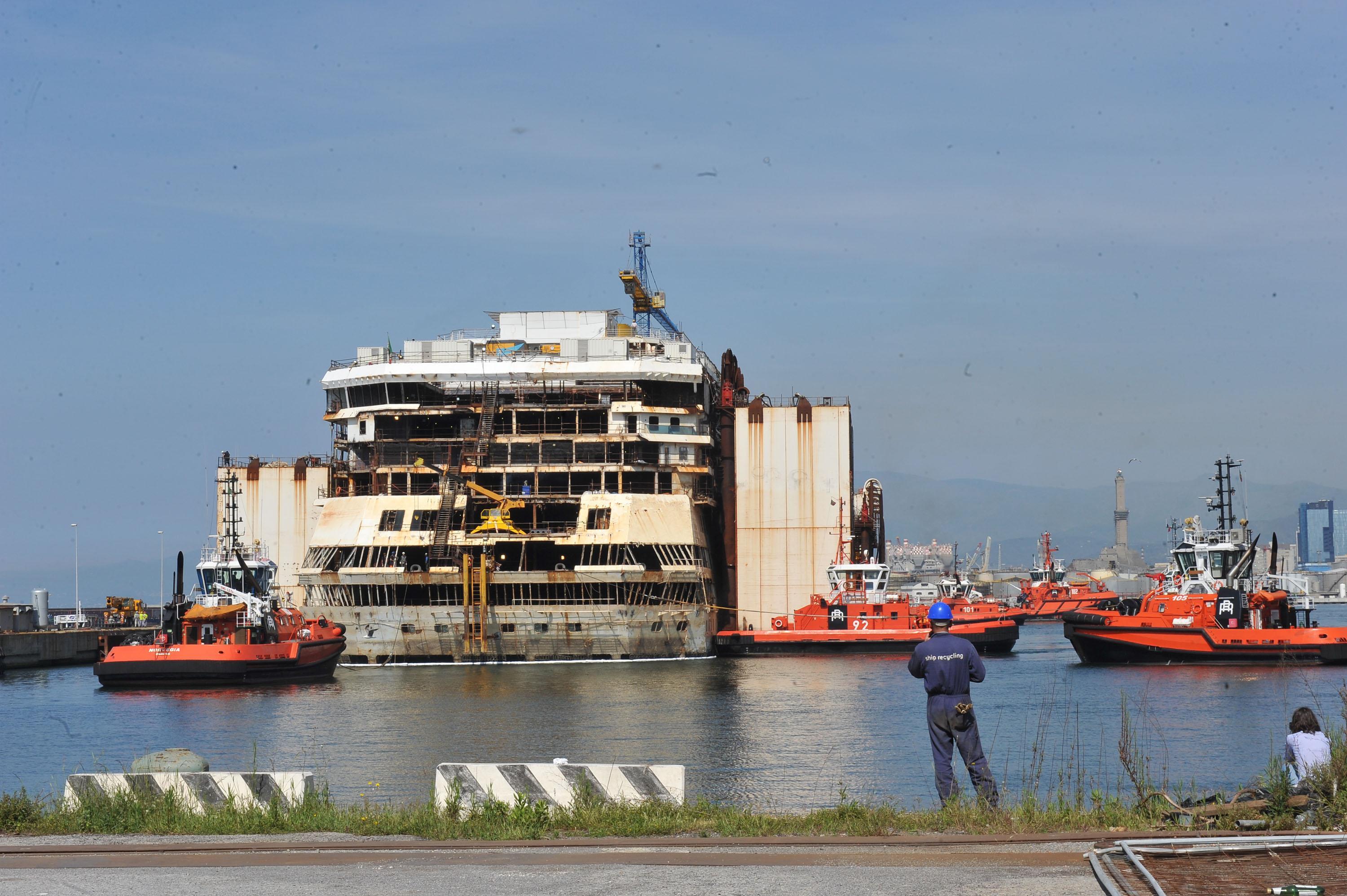 “Dalla nave saranno recuperati 55 mila tonnellate di acciaio e 2 mila tonnellate di rame”. Lo ha detto Ferdinando Garrè, amministratore delegato del Consorzio Ship recycling che sta seguendo le operazioni di ormeggio del relitto di nave Concordia. “Alla seconda fase lavoreranno oltre 250 persone – ha detto Garrè – ma non prima che la nave venga portata nel bacino a secco dove saranno tolti i cassoni di galleggiamento per essere sostituiti con un unico cassone collegato al Ponte zero”. L’operazione di smantellamento della nave “è un’operazione complessa – ha detto Garrè – iniziata quando il relitto era ancora nel porto di Voltri Prà dove è stato alleggerito. In tutto potremo recuperare e destinare al riciclo il 100% dell’acciaio e dei metalli e l’80% di tutto quello che era la nave”. A seguire il momento in cui la nave entra nell’area Riparazioni Navali (foto Ansa).