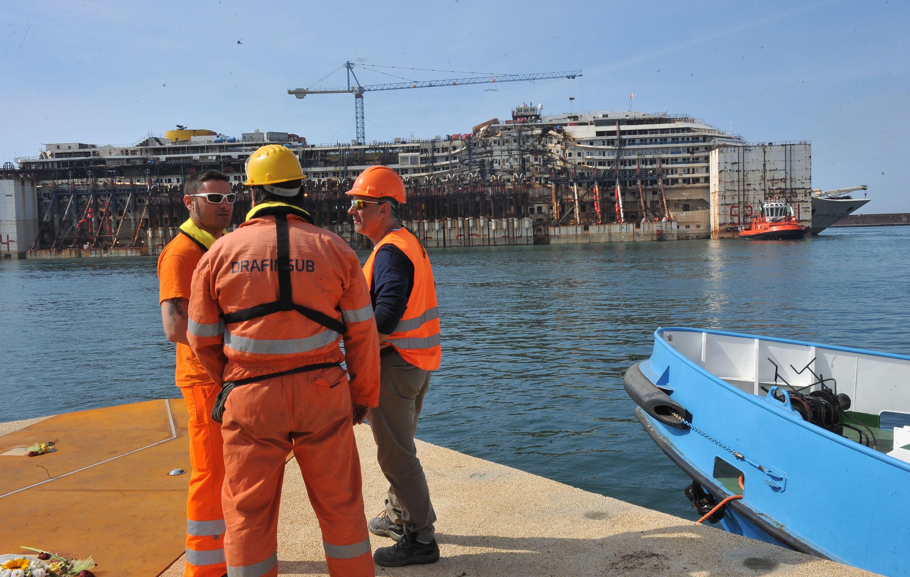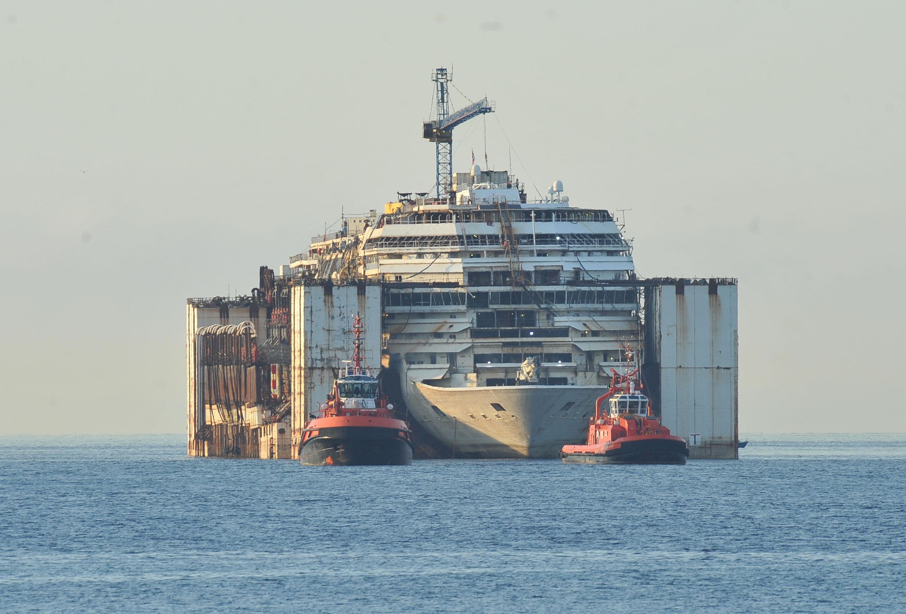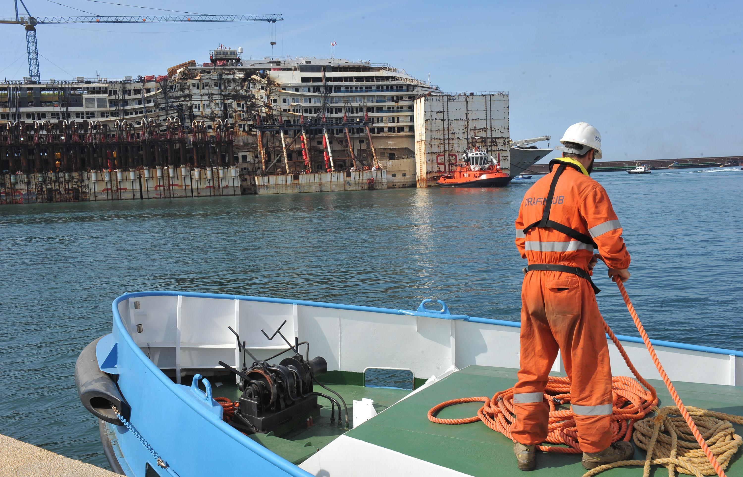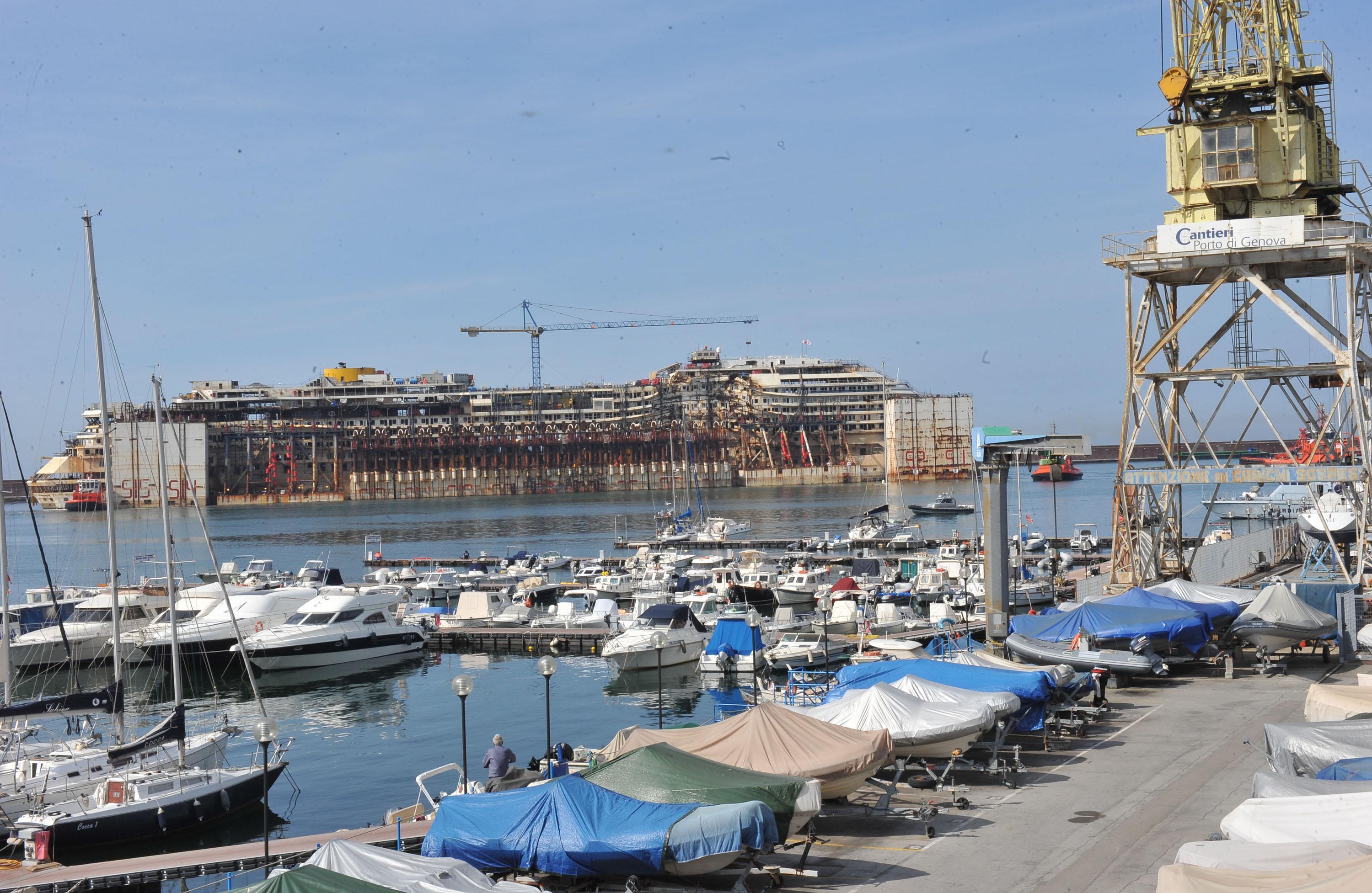 GENOVA – Il relitto della Costa Concordia partito lunedì sera dalla banchina del porto di Voltri-Prà ha raggiunto l’area dell’ex Superbacino dove verrà definitivamente smantellata. Il relitto è in banchina all’interno dell’ex Superbacino. E’ stato già fissato il primo cavo ad una delle dodici bitte che metteranno il relitto in sicurezza. Le operazioni potranno dirsi concluse con il fissaggio completo dei dodici grossi cavi fissati alle bitte della banchina.