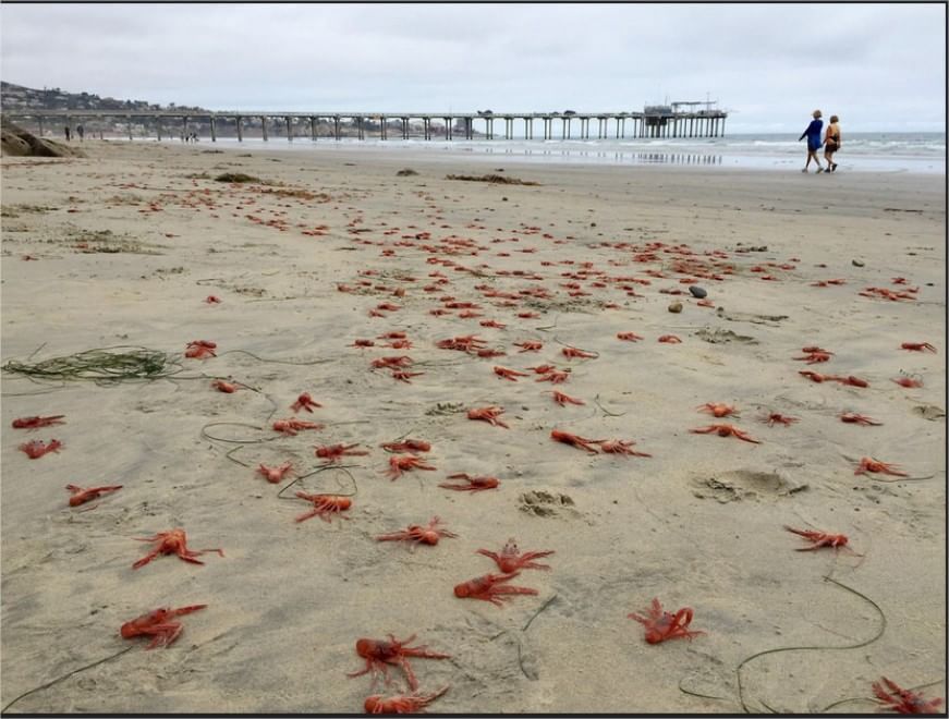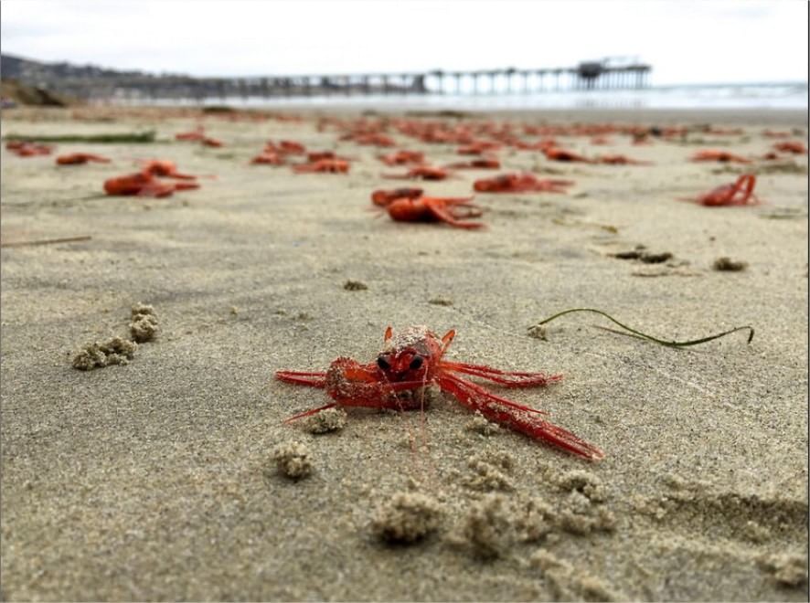 SAN DIEGO – Curiosa sorpresa su una spiaggia di San Diego, in California. Centinaia di esemplari di granchi rossi (tuna crabs) hanno invaso il litorale, trasformando la spiaggia in una distesa vermiglia.
