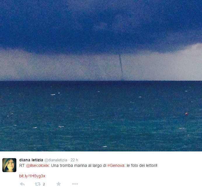 GENOVA – Trombe marine al largo di Genova: si sono formate in mare dopo che un intenso temporale si è abbattuto sul capoluogo ligure la mattina di Ferragosto muovendosi da ponente verso levante.