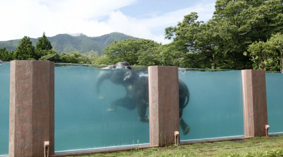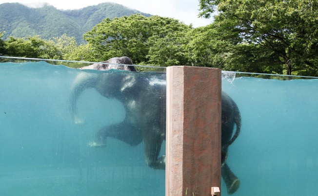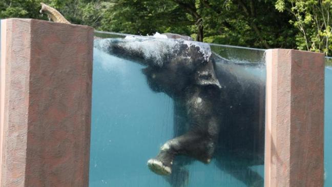 La piscina è formata da pannelli di vetro e gli spettatori possono quindi vedere lo spettacolo di questi ingombranti animali che riescono a nuotare con sorprendente grazia e leggerezza. La piscina ha avuto un notevole successo: i giapponesi si mettono in fila proprio per vedere gli elefanti.