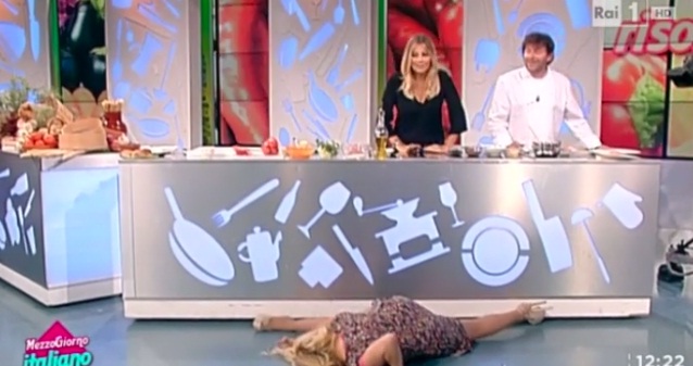 ROMA – L’intraprendente soubrette, Lisa Fusco, propone di chiudere la trasmissione con una spaccata. Ma il gesto atletico le riesce male, si fa male probabilmente a un ginocchio, interviene la conduttrice a consolarla, Lisa piange e dice che si è fatta male sul serio. E la trasmissione si chiude in anticipo. E’ quello che hanno visto i telespettatori di Mezzogiorno italiano, programma di Rai Uno condotto da Arianna Ciampoli.