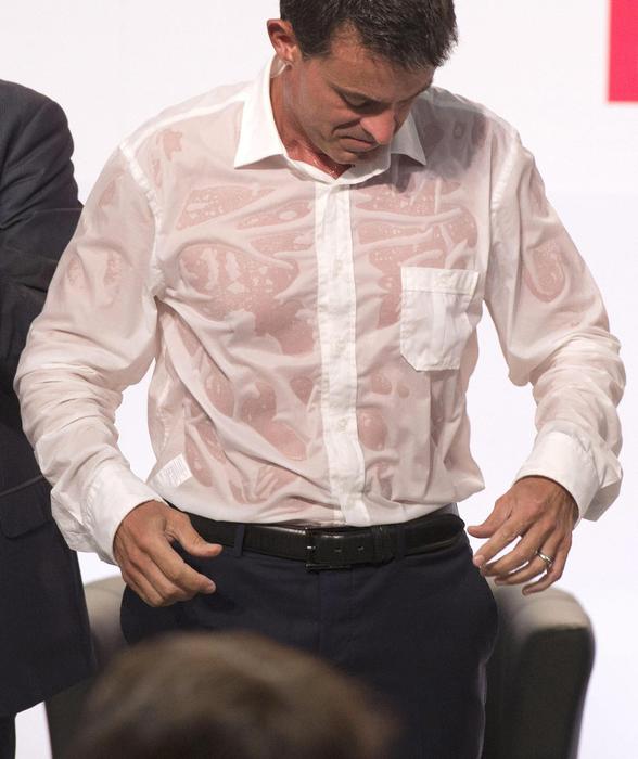 LA ROCHELLE (FRANCIA) – Camicia bagnata, alla fine del discorso: in pochi minuti il primo ministro francese, Manuel Valls, spesso ammirato per il suo bell’aspetto, è diventato l’idolo del web. Dopo un’ora di discorso al congresso estivo di La Rochelle, nell’est della Francia, un appuntamento particolarmente “bollente” non solo politicamente, Valls è apparso in tv grondante di sudore, con la camicia completamente inzuppata. La sua foto ha cominciato a fare il giro dei social network con commenti a volte ironici, ma per la maggior parte ammirati. Valls ha tenuto un discorso dai toni durissimi ed impegnati, invocando il dovere di soccorrere gli immigrati in pericolo di vita che cercano di sbarcare in Europa e respingendo le critiche alla maggioranza. In particolare, ha dovuto difendere il suo ministro dell’Economia, Emmanuel Macron, il “liberal” diventato obiettivo delle frange più a sinistra del partito e dei Giovani Socialisti.