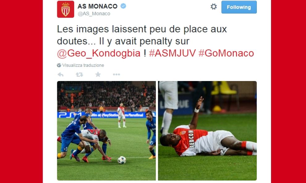 I francesi sono usciti a testa alta dalla competizione ma hanno protestato a lungo per un episodio arbitrale nella prima frazione da gioco: Kondogbia è arrivato al limite dell’area di rigore della Juventus dove è stato steso dal duo Chiellini e Vidal. Secondo l’arbitro non si è trattato di un contatto da calcio di rigore. Il Monaco ha chiesto invece con veemenza il tiro dagli undici metri.