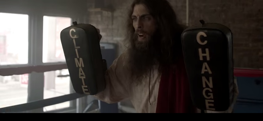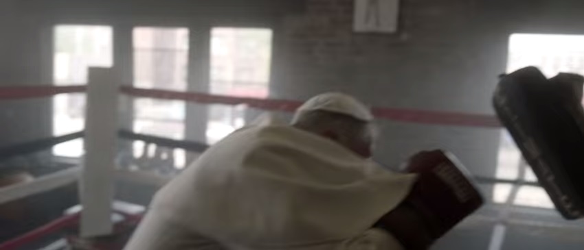 Ma il trailer va molto oltre: Francesco è ora pugile, ora esperto di arti marziali. E deve fronteggiare un malvagio inquinatore (con tanto di benda). Per aiutarlo nella sua lotta per la salvezza del pianeta arriva anche Gesù Cristo: sarà lui a farlo allenare sul ring.