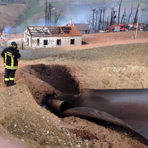 PINETO (TERAMO) – Una frana fa esplodere un metanodotto a Mutignano nel Comune di Pineto (Teramo): otto persone sono state portate in ospedale, tra cui un bambino di 10 anni. Dodici in tutto gli intossicati. La frana ha fatto crollare un traliccio della corrente elettrica su un metanodotto, che ha preso fuoco, provocando un incendio di vaste dimensioni, con fiamme visibili a chilometri di distanza. In totale sono state tre le esplosioni che hanno provocato il vasto rogo. Coinvolto il metanodotto che va da Cellino Attanasio a Bussi. Tre le abitazioni coinvolte nell’incidente. Una abitata da due famiglie per un totale di 11 persone. Per ora tre quelle curate all’ospedale, due non gravi e una con ferite più significative. La casa più vicina all’esplosione era in costruzione. La situazione è stata messa sotto controllo dopo la chiusura del gas. Il comune di Atri (Teramo) è senza fornitura.