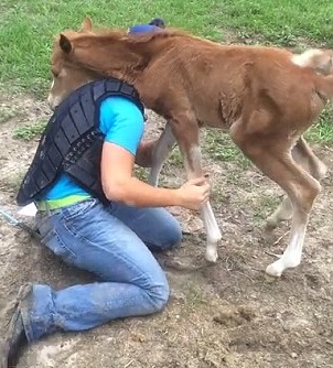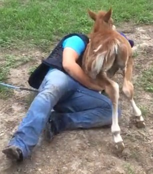 Accanto al pony e al bambino c’è un cavallo adulto che osserva la scena. Il pony, dopo essersi strofinato resta a terra sdraiato sul corpo del ragazzino per qualche secondo.