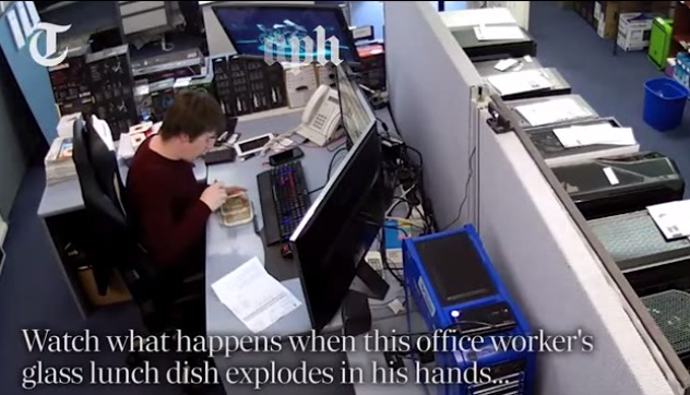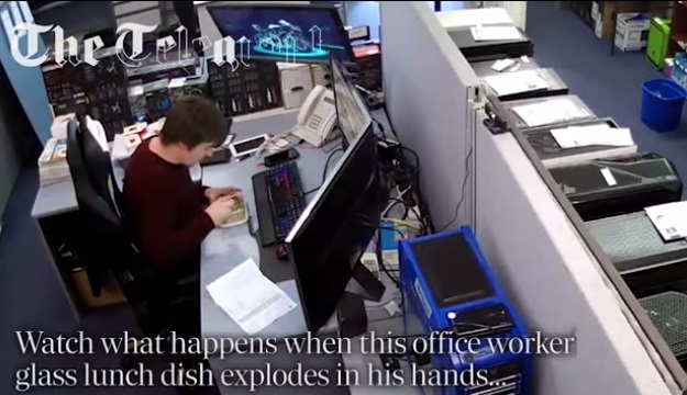 Nel video si nota come Evans non faccia nulla di insolito: mangia normalmente con la forchetta, ma all’improvviso il piatto esplode in mille schegge. Cosa possa essere accaduto lo spiega un professore di Evans. E la risposta è un difetto di fabbricazione nel piatto di vetro: