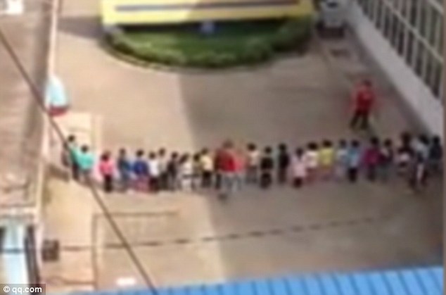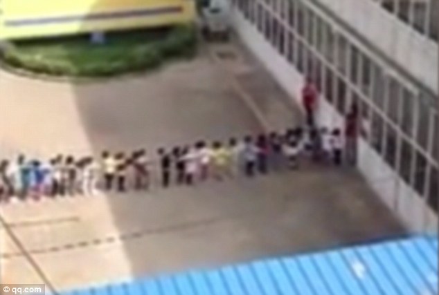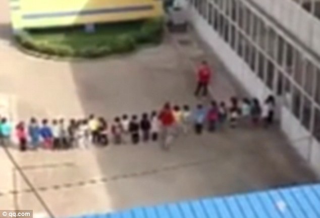 L’asilo si stava preparando per una gara di ginnastica imminente: circa 30 bambini erano allineati nel cortile della scuola in attesa di compiere degli esercizi. Il professore nel video diffuso vestito di rosso, passeggia tra i suoi studenti più volte prima di calciare uno per uno da dietro. Un altro membro del personale, anch’esso vestito di rosso, si ferma e guarda.