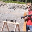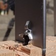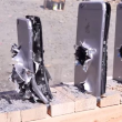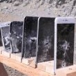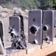 Un esperimento davvero ben fatto: gli iPhone sono stati disposti in verticale e fermati da una pedana di legno appositamente costruita. Poi ad una distanza ravvicinata il ragazzo ha esploso un colpo di kalashnikov e osservato l’esito della sua ricerca.