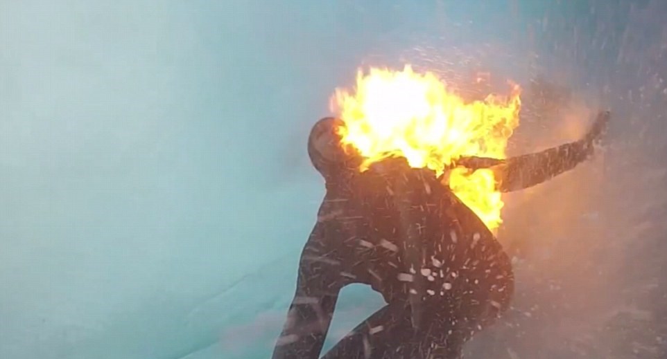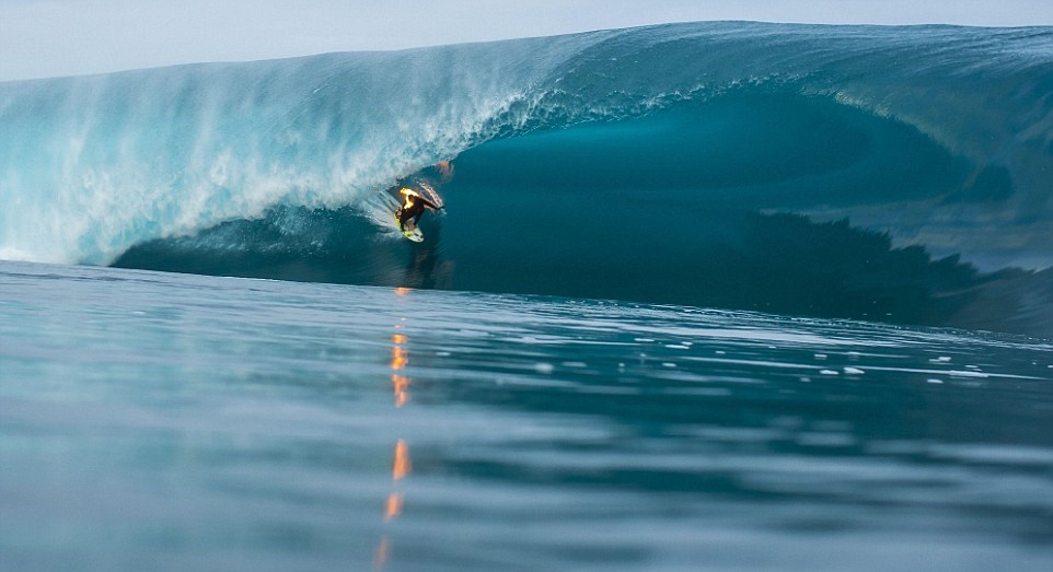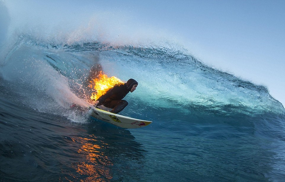 TEAHUPO’O (TAHITI) – Sulla spiaggia di Teahupo’o a Tahiti, il campione del surf Jamie O’Brien cavalca le onde con la spalla in fiamme. Il surfista originario delle Hawaii ha compiuto questa prova per la Red Bull.