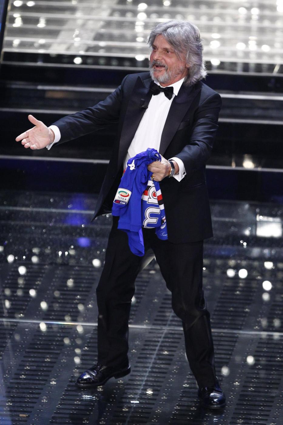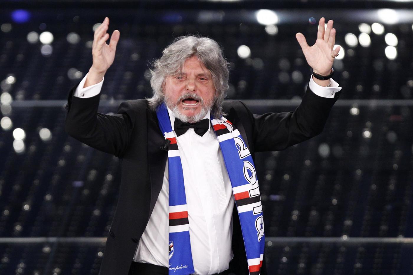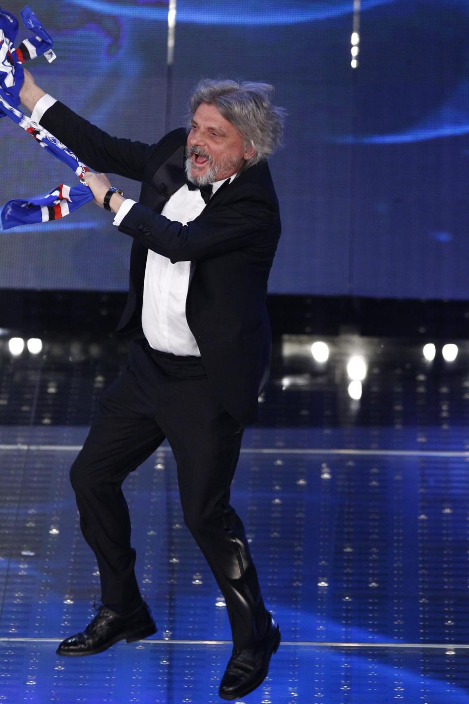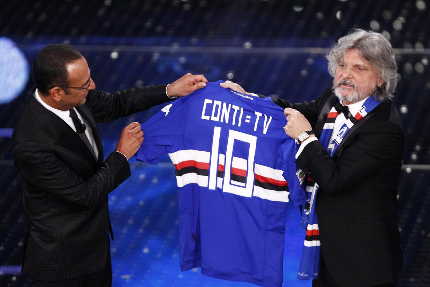 SANREMO – Massimo Ferrero, ospite nella terza serata del Festival di Sanremo, è entrato correndo sul palco ed ha esordito chiedendo “Conte o Conti?”, prima di regalare al conduttore una maglietta della squadra blucerchiata con il numero 10 e la scritta “Conti uguale Tv”. Ferrero si è poi esibito cantando “Vita spericolata” di Vasco Rossi. “Non è Crozza, è l’originale”, ha concluso Carlo Conti, rivolgendosi scherzando al presidente della Sampdoria.