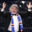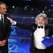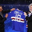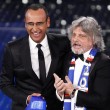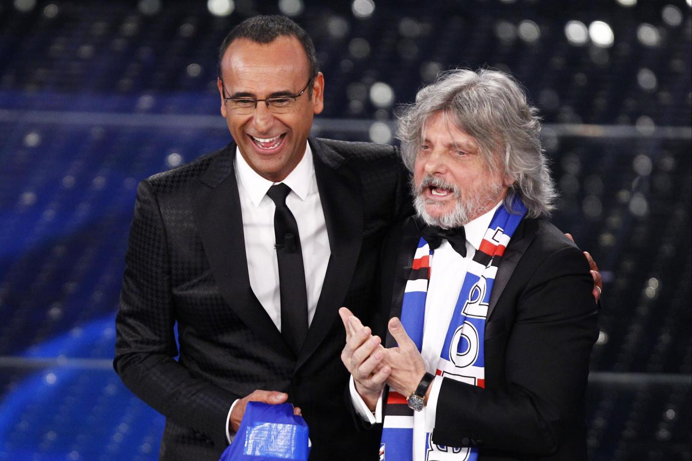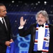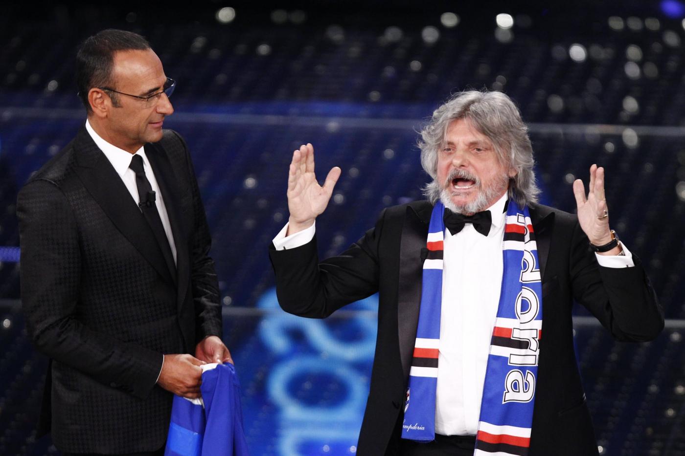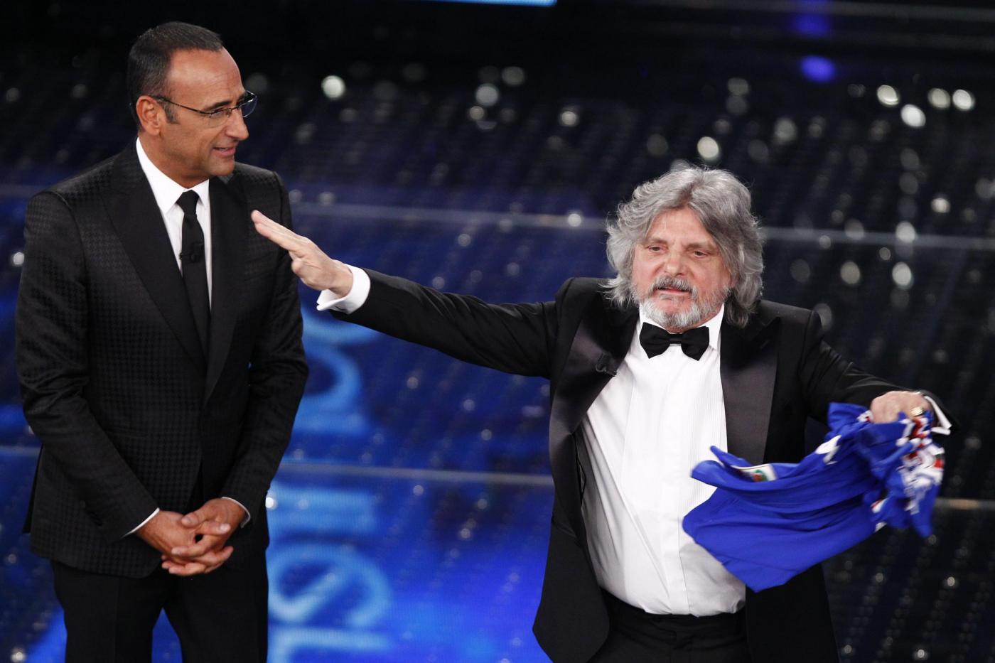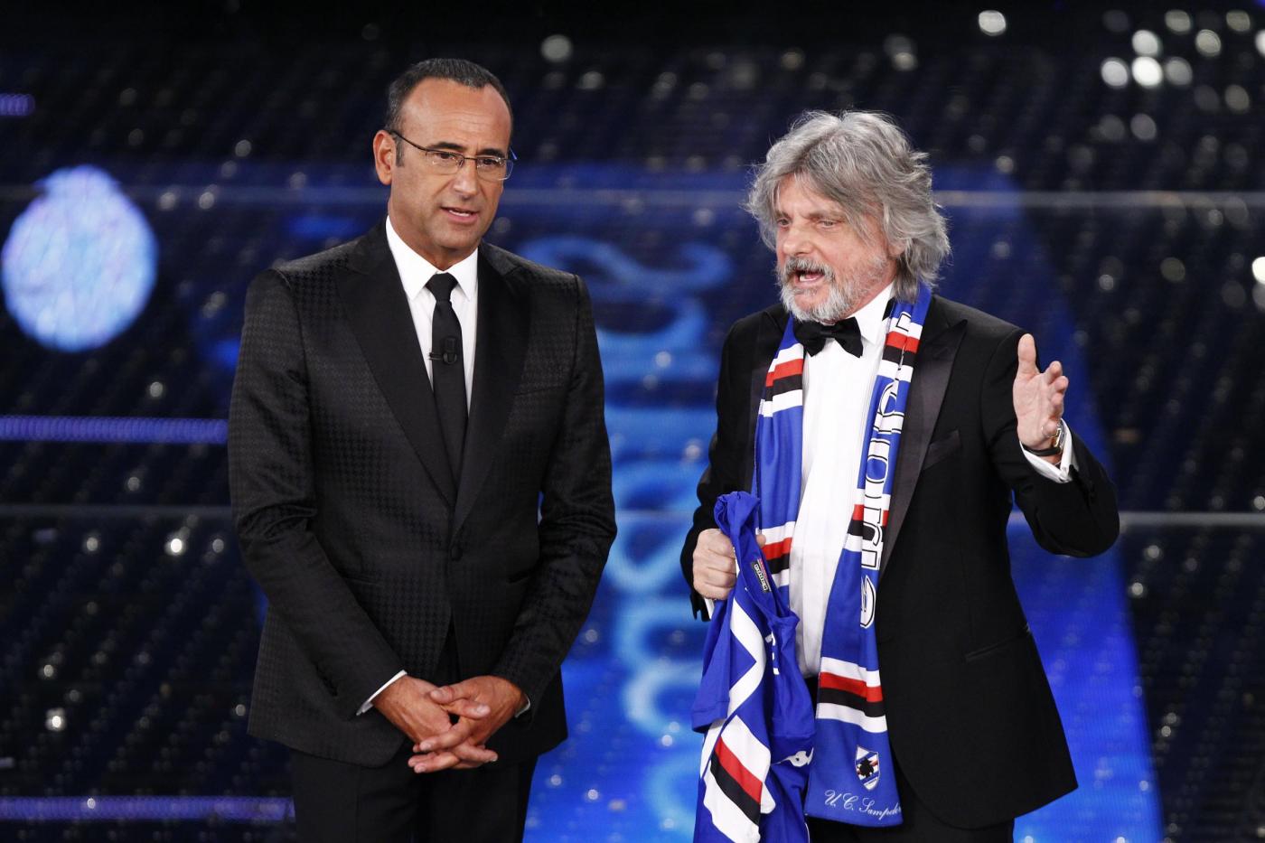 SANREMO – Massimo Ferrero, ospite nella terza serata del Festival di Sanremo, è entrato correndo sul palco ed ha esordito chiedendo “Conte o Conti?”, prima di regalare al conduttore una maglietta della squadra blucerchiata con il numero 10 e la scritta “Conti uguale Tv”. Ferrero si è poi esibito cantando “Vita spericolata” di Vasco Rossi. “Non è Crozza, è l’originale”, ha concluso Carlo Conti, rivolgendosi scherzando al presidente della Sampdoria.