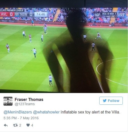BIRMINGHAM – Già da metà aprile l’Aston Villa, la gloriosa squadra di Birmingham in Inghilterra è retrocessa in serie B. E così i tifosi, non soddisfatti del “finale glorioso” che avevano chiesto ai loro beniamini come condizione minima, hanno lanciato sex toys e bamboline gonfiabili in campo. Davvero un modo insolito di protestare. Gianmichele Laino di Sportface.it scrive: