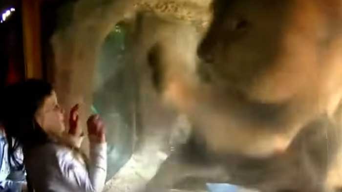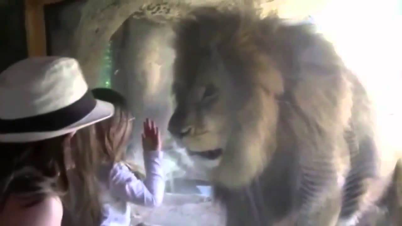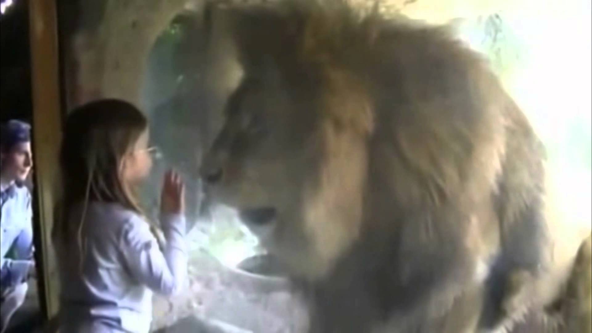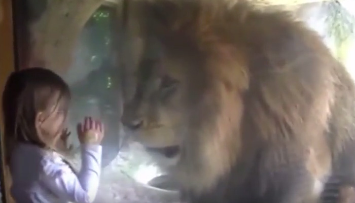 La piccola, senza nessuna paura, lo ha fissato negli occhi e poi, forse per consolarlo, ha deciso di dargli un bacino (separata dal vetro naturalmente). Il leone, a quel punto, ha tirato fuori tutta la sua grinta repressa e ha iniziato a dare le zampate al vetro.