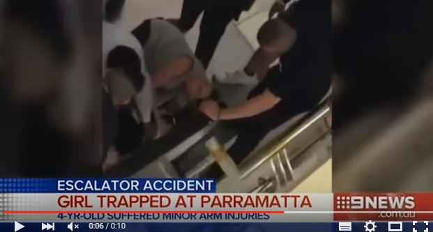 Il braccio della bambina era in qualche modo stato catturato nel nastro trasportatore corrimano ed è rimasto intrappolato finché ha raggiunto il pavimento nel Parramatta Westfield a ovest di Sydney.