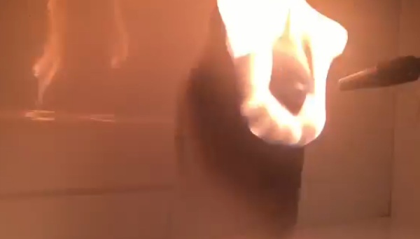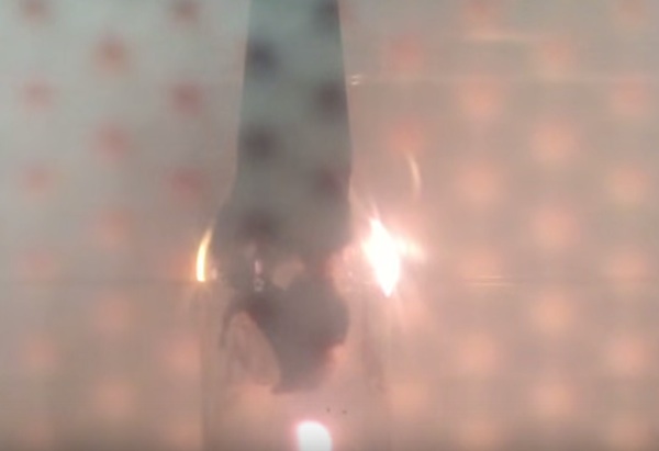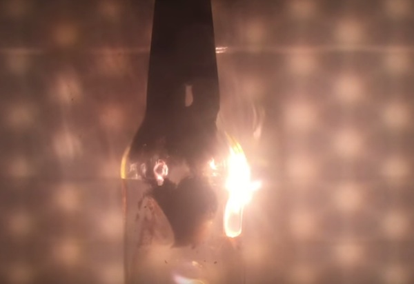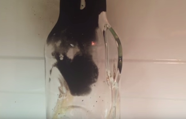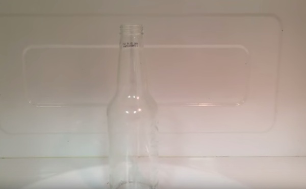 La bottiglia di vetro è stata precedente surriscaldata con la fiamma ossidrica, provocandone la frattura. L’esposizione alle onde elettromagnetiche ha fatto il resto: il vetro si è letteralmente squagliato. Della serie, non provatelo a casa!