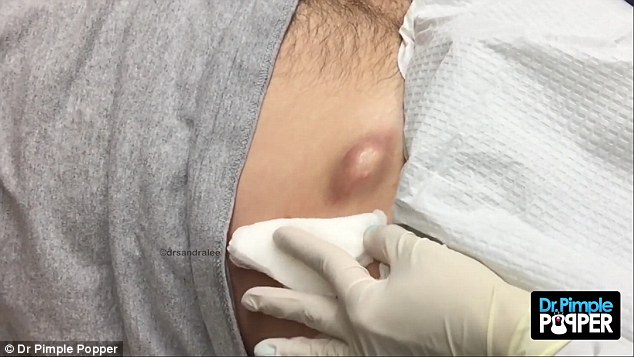 Le immagini sono sconsigliate ai deboli di stomaco: quello che si vede è il dermatologo che opera un uomo a pancia in su. La cisti infiammata è sul fianco destro e viene incisa. A questo punto fuoriesce il liquido bianco che non è altro che pus.