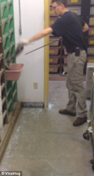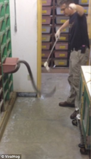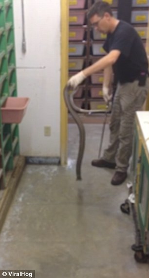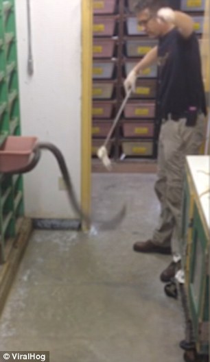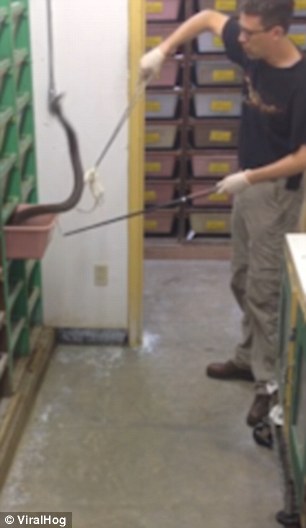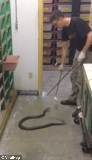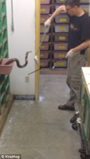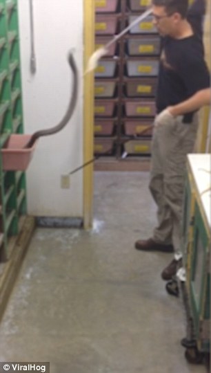 Nel filmato pubblicato dal Daily Mail si vedono questi serpenti che sporgono con la testa fuori dalla tana a forma di cassetto in cui vivono. L’uomo afferra con una tenaglia i topi, apre il cassettino, e lo mette a disposizione dei serpenti. Nel filmato però, uno dei serpenti mette la testa fuori dalla scatola e cade fuori dalla scatola. A Questo punto il serpente si mette in una posizione di attacco: il giovane però non si perde d’animo e con tenaglia e guanti riesce dopo aver lottato un po’ di tempo col serpente a rimetterlo nella tana.