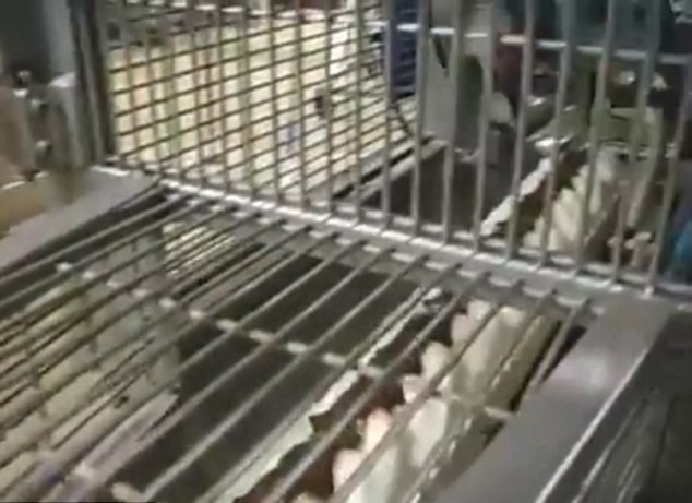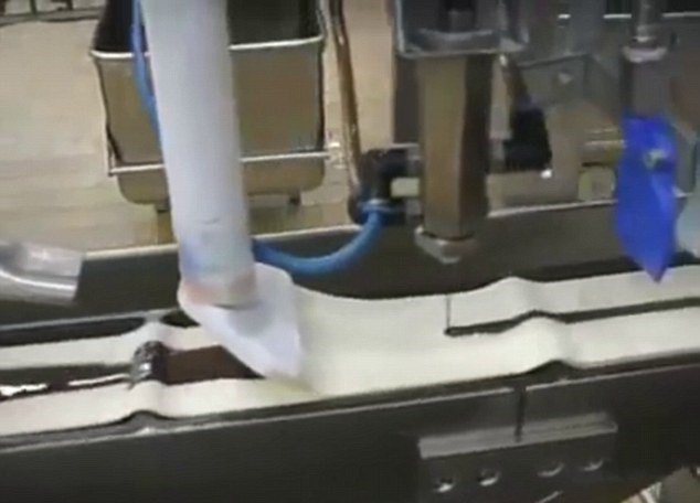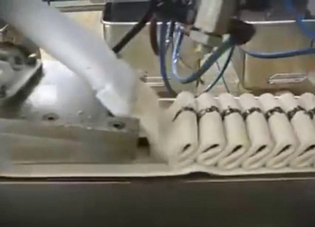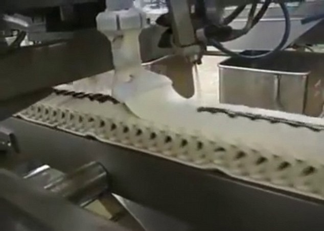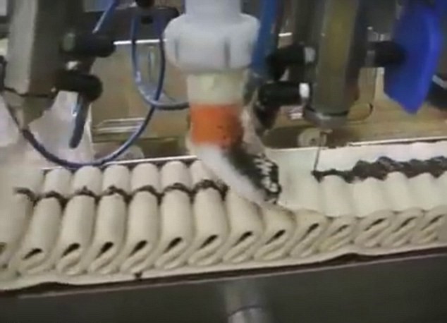 Il cioccolato viene sparso su un unico lungo strato di gelato, poi viene sistemato con una specie di pennello che sposta l’impasto nel punto voluto. Il gelato, dopo essere farcito nei vari strati viene ripiegato in su e tagliato in parti uguali. I pezzi malformati finiscono invece in un bidone della spazzatura.