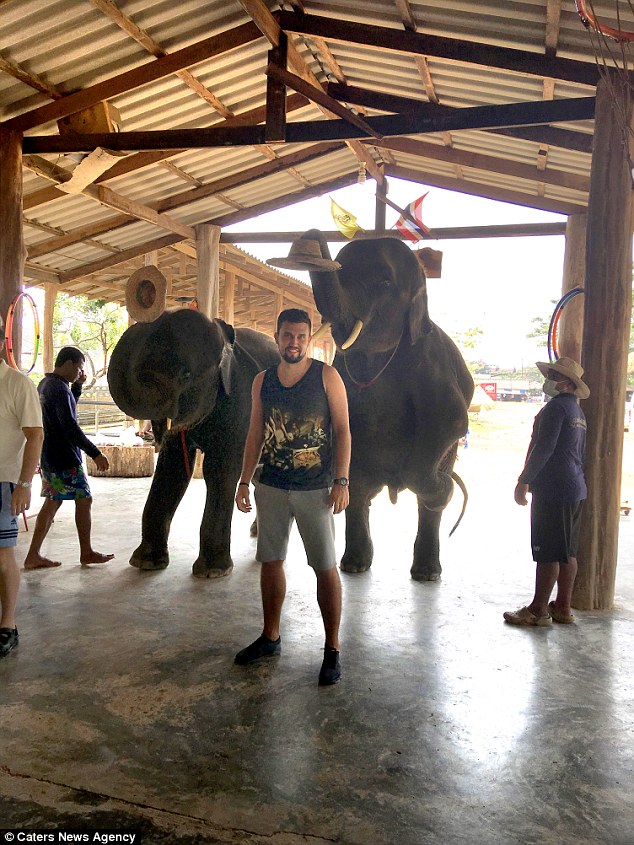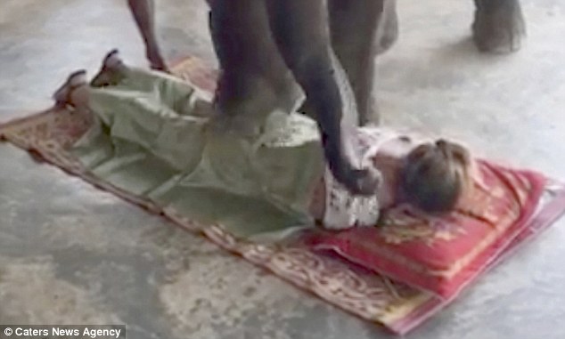 L’animale, naturalmente ammaestrato, ripete con grande abilità le tecniche e i movimenti di un massaggiatore professionista aiutandosi con le zampe e la proboscite. Avviso ai temerari: per quanto la pratica sembri innocua e divertente, non si possono escludere i rischi.