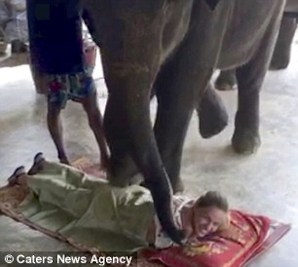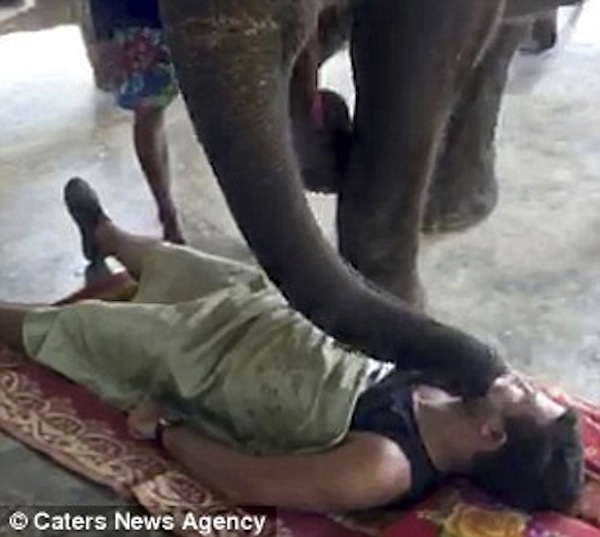 Guardare per credere: in questo video si vedono due turisti americani in luna di miele che sperimentano l’insolito massaggio in un parco a Kong Chang Island. I volontari sdraiati a terra, si lasciano sfiorare da un piccolo (si fa per dire) pachiderma, del peso di una tonnellata.
