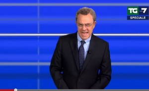 ROMA – Enrico Mentana rimane senza voce durante la lettura dei titoli di testa del telegiornale delle 20 del 14 gennaio 2016. Il presentatore (e direttore) del Tg La7 ha mostrato i primi segni di cedimento mentre presentava i titoli sulla Libia, poi ha dovuto alzare bandiera bianca definitivamente mentre scorrevano le immagini relative al caso Renault. Prima il calo di voce, poi addirittura si ode solo un respiro affannoso e i disperati tentativi di Mentana di portare comunque a termine il proprio compito. Alla fine la resa è inevitabile: “Niente titoli andiamo direttamente al giornale” si sforza si dire il giornalista.