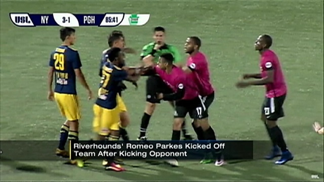 PITTSBURGH – L’aribitro lo espelle e lui rifila un calcio ad un avversario di spalle. Ora Romeo Parkes, giocatore dei Pittsburgh Riverhounds, club della USL, la terza categoria degli Stati Uniti, si beccherà una lunghissima squalifica. Il fatto è accaduto durante il match con i New York Red Bull II: Parkes, durante il match di sabato 7 maggio ha colpito il difensore avversario Karl Ouimette.