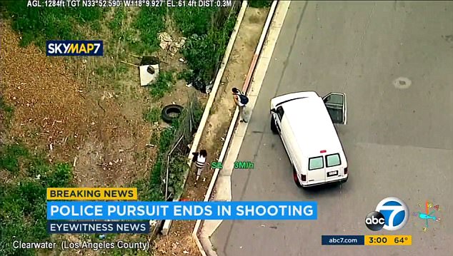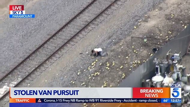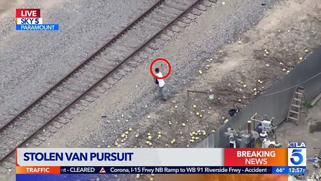 Gli elicotteri della tv riprende l’inseguimento culminato in una zona degradata che si trova vicino alla ferrovia che passa nei pressi di East Artesia Boulevard e Cherry avenue. Qui, l’uomo che ha rubato il furgone in un centro commerciale comincia a correre verso la ferrovia. La donna invece, dopo aver gettato alcuni sacchetti a terra scappa verso il vicino bosco.