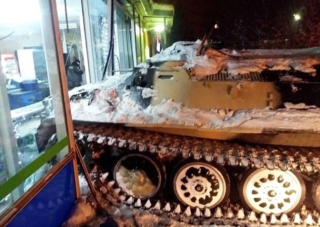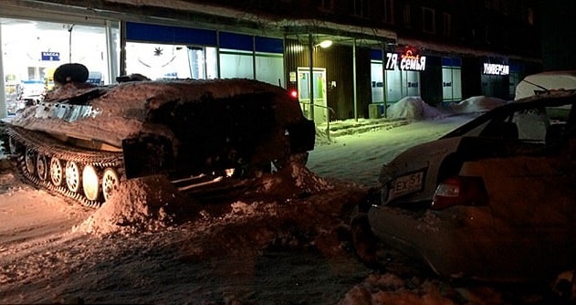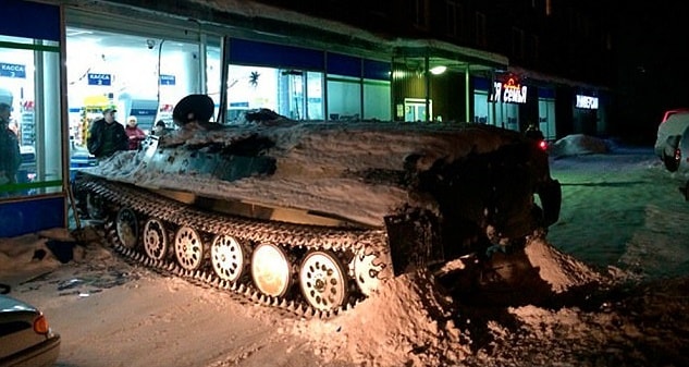 MURMANSK – In Russia, un uomo voleva disperatamente una bottiglia di vino al punto da rubare un carro armato da un’organizzazione militare locale di addestramento, con l’obbiettivo di sfondare l’entrata di un supermercato. Nel percorso, come mostra il video YouTube, ha anche perso il controllo e si è schiantato contro una Daewoo nella città artica di Murmansk; è saltato fuori dal carro armato, di epoca sovietica, un M-1970, e ha afferrato il vino dallo scaffale del supermercato.