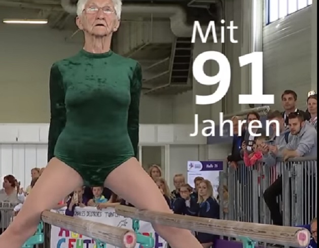 BERLINO – Johanna Quaas ha 91 anni ed ha partecipato tra i senior al Deutsches Turnfest di Berlino, arrivando al quarto posto. La donna anziana, come mostra questo video YouTube, malgrado l’età è in grado di mettersi a testa in giù, in verticale o in orizzontale, reggendosi solo con le braccia.