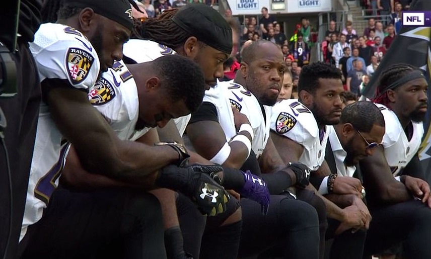Tutti i campioni dei Jacksonville Jaguars e dei Baltimore Ravens si sono inginocchiati in segno di protesta. In piedi gli allenatori e i proprietari dei due team con le mani sulle spalle dei loro giocatori in segno di solidarietà. Tantissimi altri dello staff delle due squadre hanno seguito l’esempio dei loro campioni in un clima surreale.