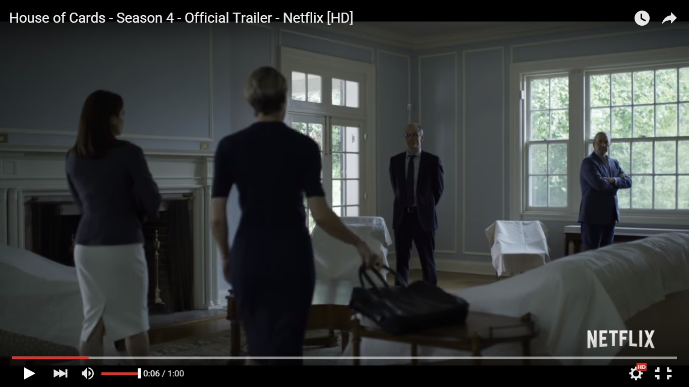 Dopo una serie di spot per le presidenziali di Underwood (dai quali si poteva anche evincere che the Claire situation fosse superata) la produzione ha tirato fuori un trailer di 60 secondi in cui capiamo qual è il centro drammatico di questa stagione: “Non hai idea di cosa significhi non avere nulla. Tu non apprezzi quello che abbiamo raggiunto. Ho dovuto lottare per qualsiasi cosa che abbia avuto dalla vita” dice a Claire la voce fuoricampo di Frank Underwood. Quindi brevi flash: sangue che gocciola da un rubinetto, violenza, sesso, denaro contante. E poi Claire che dice “Ho visto il futuro, il nostro futuro” e Frank che la blocca “Avevamo un futuro, finché tu non hai cominciato a distruggerlo”.