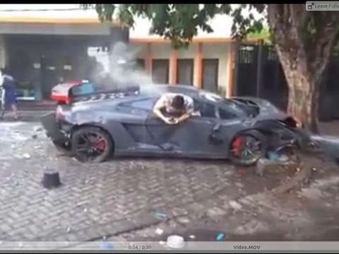 GIACARTA – E’ uscito dal finestrino della sua Lamborghini accartocciata contro un albero, mentre mandava un sms col cellulare. Sono le immagini choc riprese da alcuni testimoni dopo un terribile incidente a Surabaya, in Indonesia.