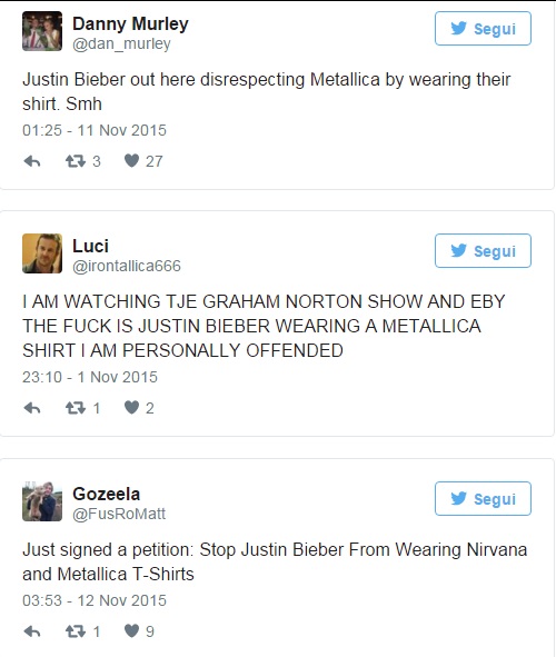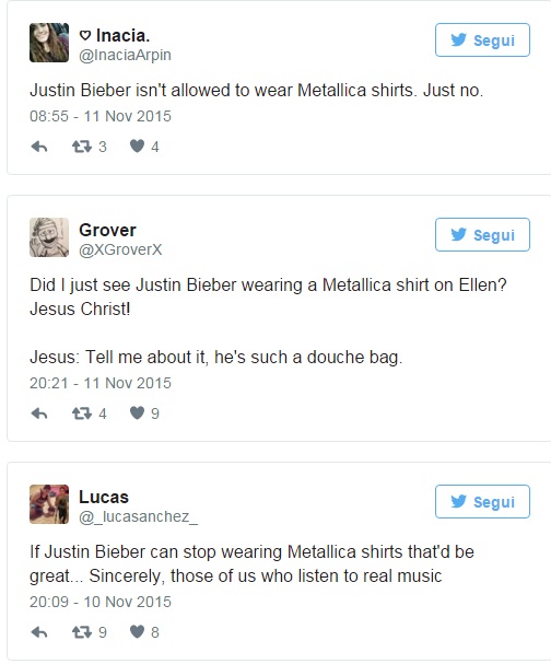 ROMA – Metallari di tutto il mondo uniti per protestare contro Justin Bieber che si è presentato in video nella trasmissione di Ellen DeGeneres indossando una maglietta dei Metallica.