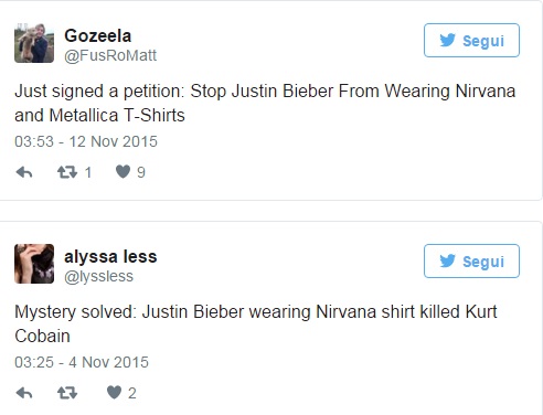 “Justin Bieber ha vinto il premio Best Look e siamo sicuri che parte di questo successo sia dovuto anche alle mise che la giovane popstar sfoggia al di fuori della sua vita pubblica Justin è infatti un grande fan delle magliette con i loghi delle rockstar. Niente di male se non fosse che il popolo dei social faccia un gran casino ogni volta in cui viene avvistato con una t-shirt rock’n’roll. Negli ultimi giorni infatti Justin è stato ospite di Ellen DeGeneres indossando la maglietta dei Metallica (guardate sopra) ed è stato fotografato con una dei Nirvana”.