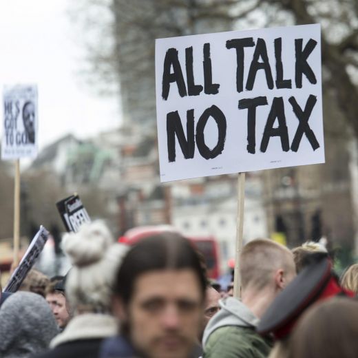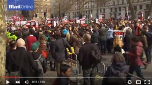 I media mostrano foto della folla di manifestanti a Whitehall, fuori dai cancelli che chiudono Downing Street, con cartelli e striscioni con gli slogan “He’s Got to Go” (Se ne deve andare), “Defy Tory Rule” (Sfida il potere conservatore). Alcuni manifestanti indossano maschere da maiale e ostentano cartelli con foto di Cameron con il naso ritoccato con quello di un suino e la scritta “Greedy Pig” (Ingordo). Un cordone di poliziotti è schierato davanti al cancello della strada con la residenza del premier. Fra i manifestanti notati dai media nella folla, anche la cantante pop Lily Allen.