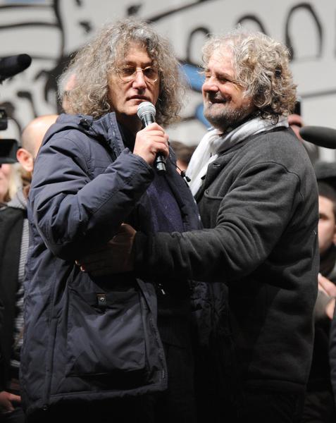 Beppe Grillo, leader del Movimento 5 Stelle, con Gianroberto Casaleggio durante il comizio in Piazza San Giovanni a Roma, 22 febbraio 2013.