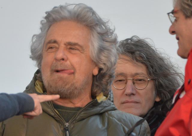 Beppe Grillo (c) e Gianroberto Casaleggio (s) durante la manifestazione di chiusura della campagna elettorale per le elezioni Europee del Movimento Cinque Stelle a piazza San Giovanni, Roma, 23 maggio 2014.