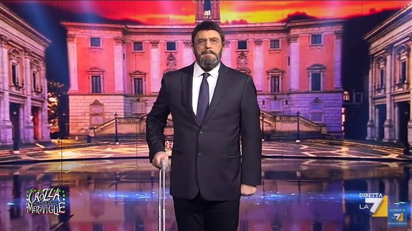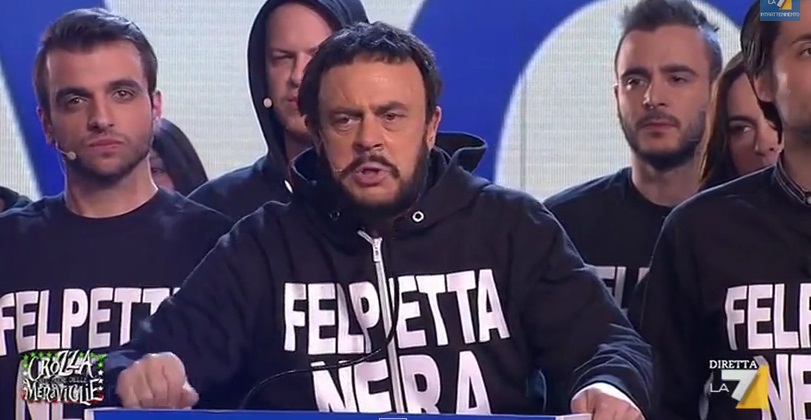 Infine l’immancabile imitazione di Renzi: “Renzi ha detto tagghiamo i sospetti’. Ve lo giuro. Togliamogli l’amicizia sui social. Terroristi basta con i likes alle foto sulle pizzate. Devono rimanerci male. Non rispondiamo alle loro chat”. “Tagghiamo i sospetti: bombardarli di squillini no?”.