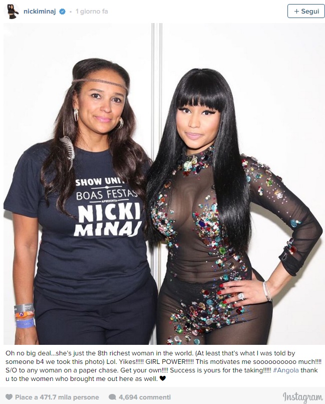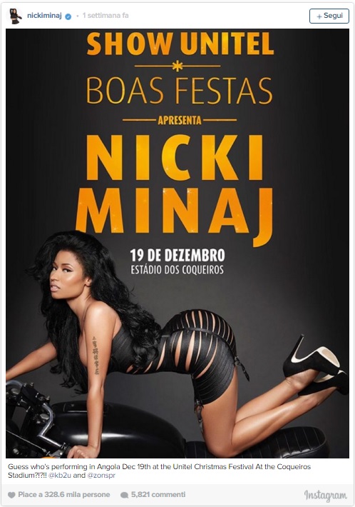 LUANDA (ANGOLA) – Sabato 19 dicembre la cantante statunitense Nicki Minaj ha tenuto un concerto a Luanda, la capitale dell’Angola. Fin qui niente di male se non fosse che il concerto faceva parte di un festival natalizio sponsorizzato da Unitel, una società di telecomunicazione controllata dalla figlia di Jose Eduardo dos Santos, presidente e dittatore dell’Angola dal 1979.