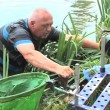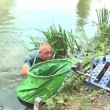 L’uomo, una volta in acqua cerca di ricomporsi. Si appoggia sul bordo del lago e prova a rialzarsi in piedi.