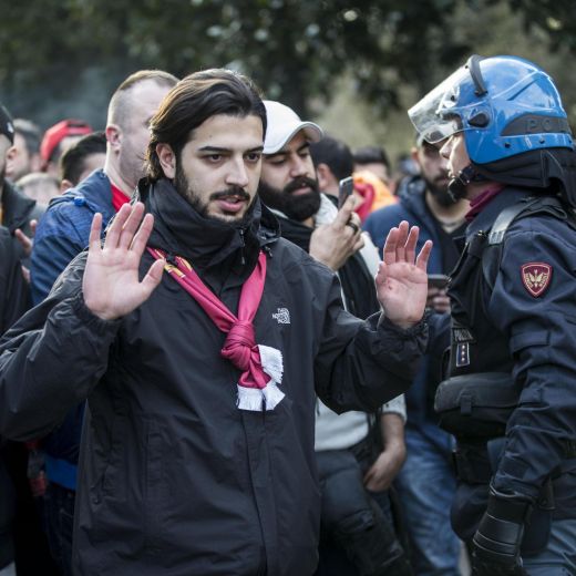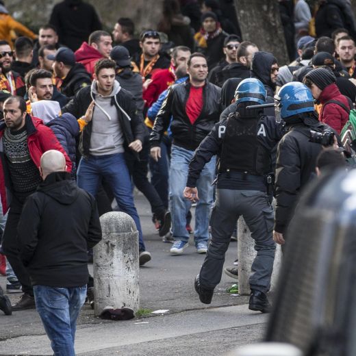 Proprio allo stadio olimpico la tensione tra tifoseria turca e polizia è arrivata al culmine, con gli ultras turchi che tentavano di aggirare il cordone che li separa dalla zona in cui vengono indirizzati verso gli autobus messi a disposizione da Atac (che ha registrato il danneggiamento su uno dei mezzi per il lancio di un petardo) per il trasferimento all’Olimpico. La situazione è tornata presto alla normalità grazie anche all’intervento di alcuni capi ultrà della squadra turca e il pugno duro del piano di sicurezza.