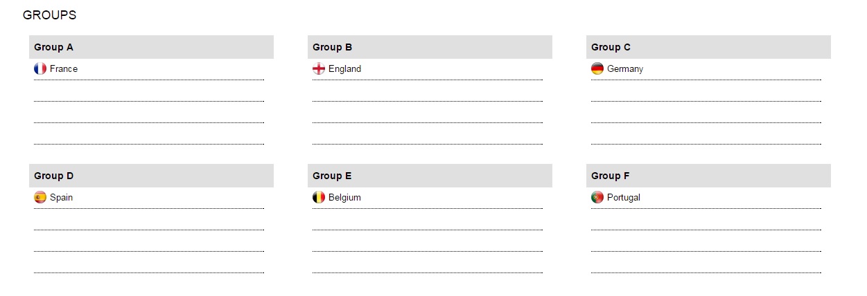 - Urna uno: Francia (Paese ospitante), Spagna (campione uscente), Germania, Inghilterra, Portogallo, Belgio