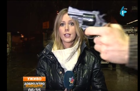 NOVI SAD – La reporter è collegata per una diretta quando all’improvviso spunta un uomo che agita una pistola davanti alla giornalista e alla telecamera prima di allontanarsi. È successo a Novi Sad, in Serbia. Protagonista l’inviata della tv Radio Televizija Vojvodine che nonostante il fuoriprogramma è rimasta impassibile. La tv ha denunciato all’autorità l’accaduto.