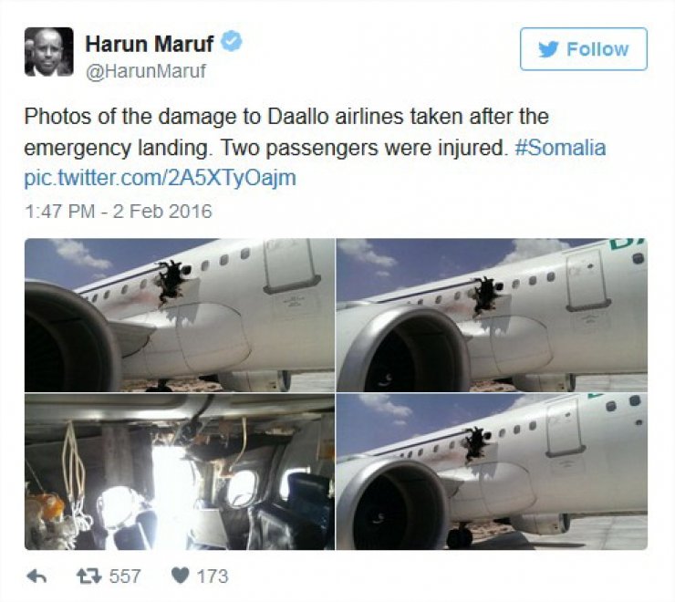 La polizia, riporta ancora il Mirror, per il momento valuta l’accaduto come “sospetto”. Le foto apparse sul sito in somalo di Voice Of America mostrano l’aereo, un Airbus A-321, con uno squarcio verticale annerito fra i finestrini sul fianco destro sopra l’ala. Un’altra foto mostra l’apertura vista dall’interno della cabina, con le mascherine dell’ossigeno penzolanti fuori dei loro alloggiamenti.