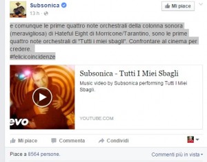 ROMA – Ennio Morricone ha “preso spunto” dai Subsonica per la colonna sonora di The Hateful Eight, ultimo film di Quentin Tarantino? E’ la band torinese a insinuarlo con un post su Facebook che recita così: