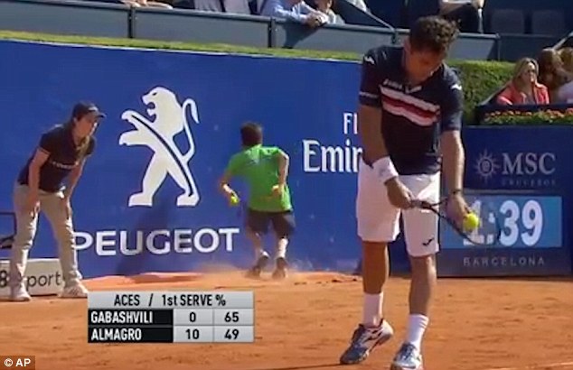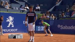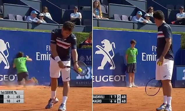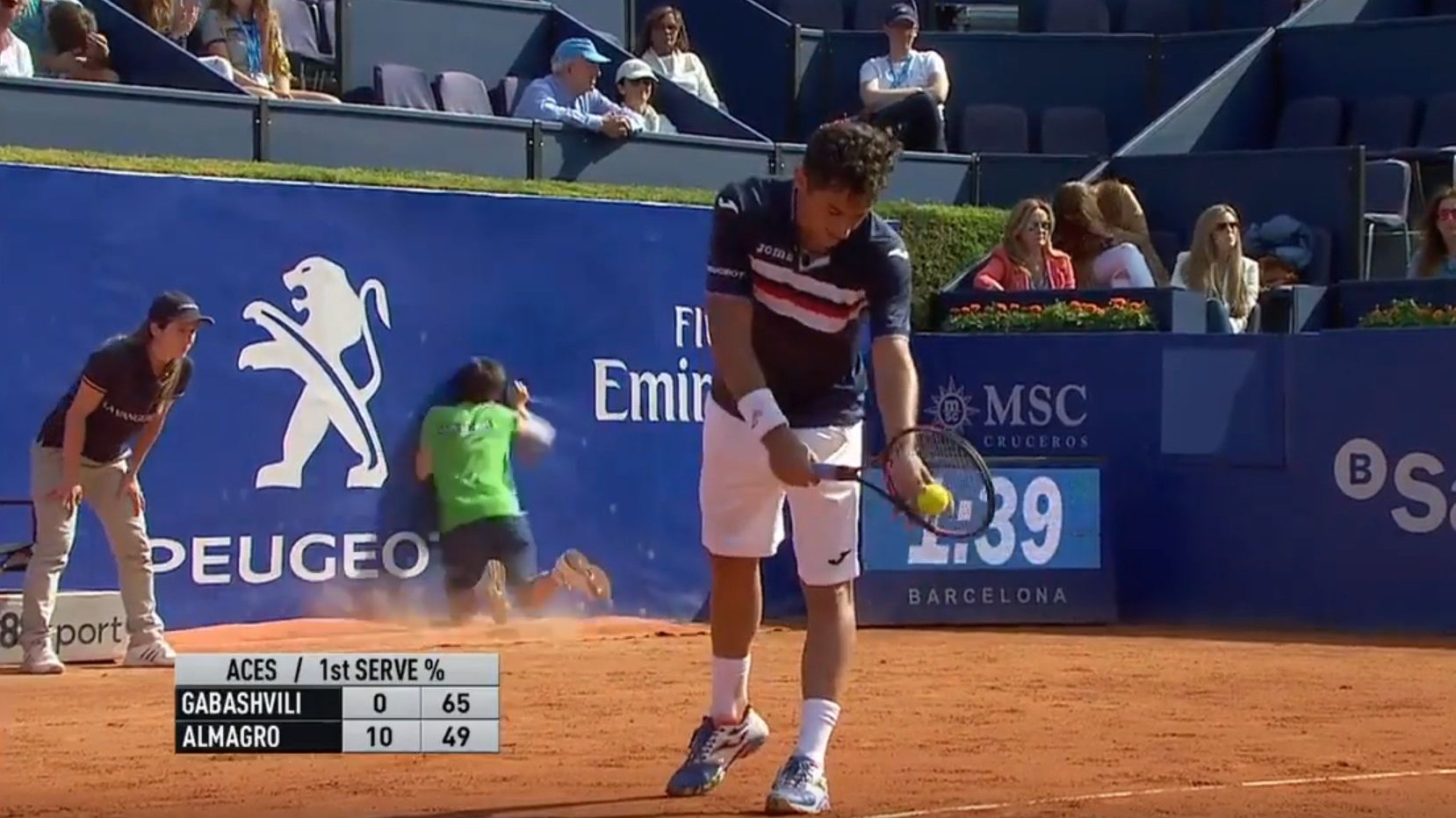 BARCELLONA – Durante il match di tennis valido per il torneo Atp 500 di Barcellona in cui si sfidano il russo Tejmuraz Gabashvili e lo spagnolo Nicolas Almagro, un raccattapale inciampa e sbatte contro la pubblicità sul muro di protezione.
