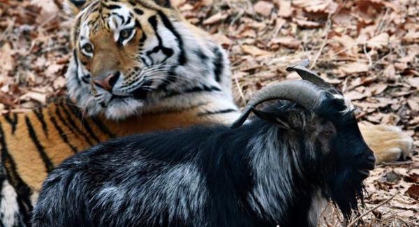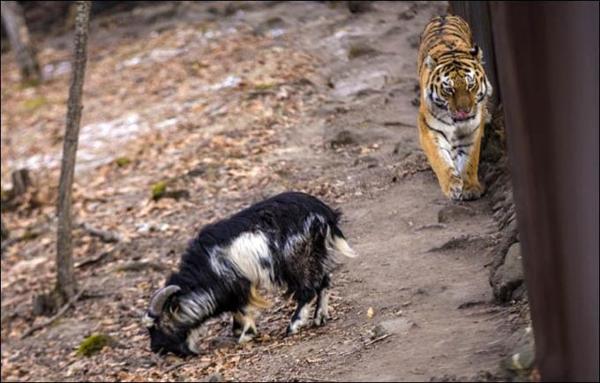 Nel novembre scorso, gli operatori del Far East Safari Park avevano fatto entrare una capra nello stesso luogo in cui è ospitata una tigre. !uella che doveva essere la sua cena è diventata una insostituibile compagna. Da quel momento la capra è rimasta con la tigre diventando nel frattempo obesa dato che ha guadagnato circa 20 chili in tre mesi.