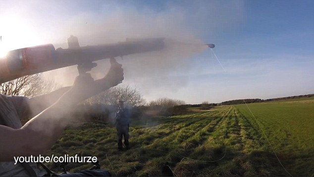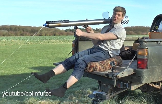 In un video, il ragazzo di 32 anni che si diverte a postare video in cui spara alle più svariate cose con un lanciarazzi, è seduto sul retro di un camion parcheggiato nel mezzo di un campo con un paio di calze nere in piedi. Un pezzo di corda bianca è legato intorno allle punte di ogni calzino. L’altra estremità della corda è invece attaccata a questo lanciarazzi fatto in casa che Furze posiziona sulla sua spalla.